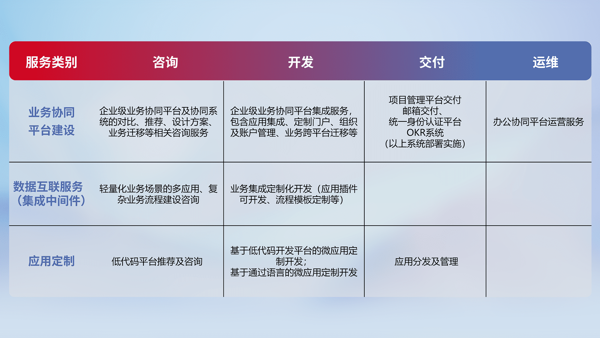 针对钉钉、、企微、、、IDaas等平台级产品提供产品的规划、、、方案、、交付、、定制化开发等服务,,,,实现如统一协同办公、、、、智能客户服务、、、混合会议管理、、智能数据查询、、、、等业务场景,,,,实现数字化转型。。